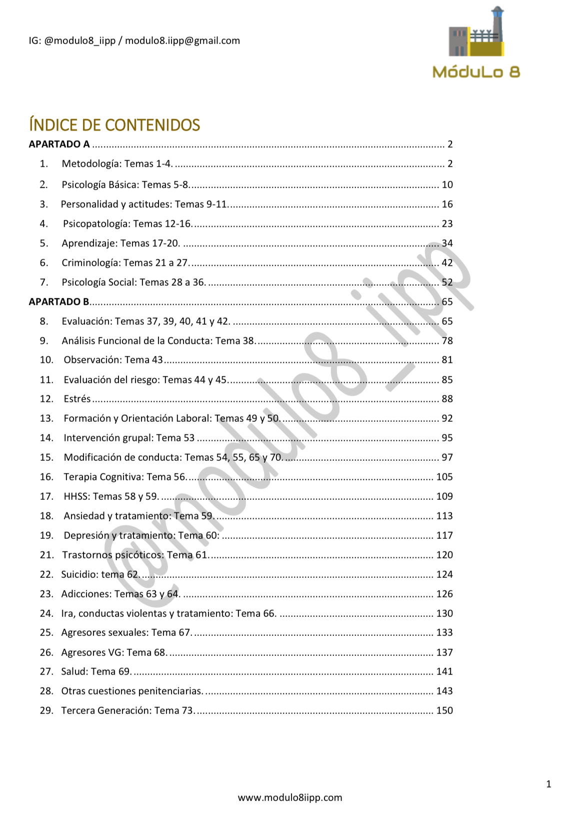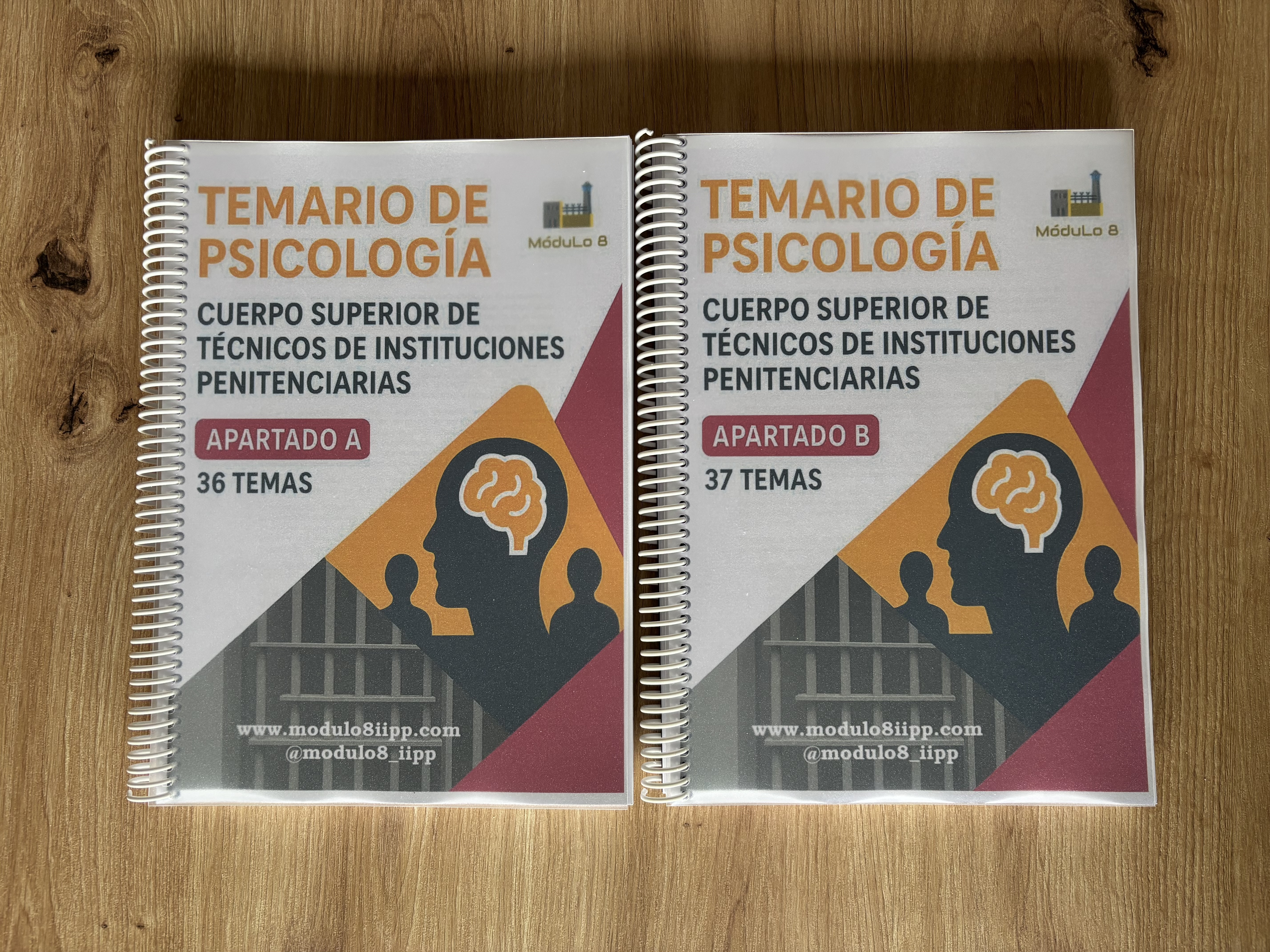 73 Temas de Psicología, de 6 páginas de extensión para no perder tiempo sintetizando. Este temario es de elaboración propia y cuenta con la constante aplicación del contenido al medio penitenciario, además de incluir resultados de estudios de investigación.